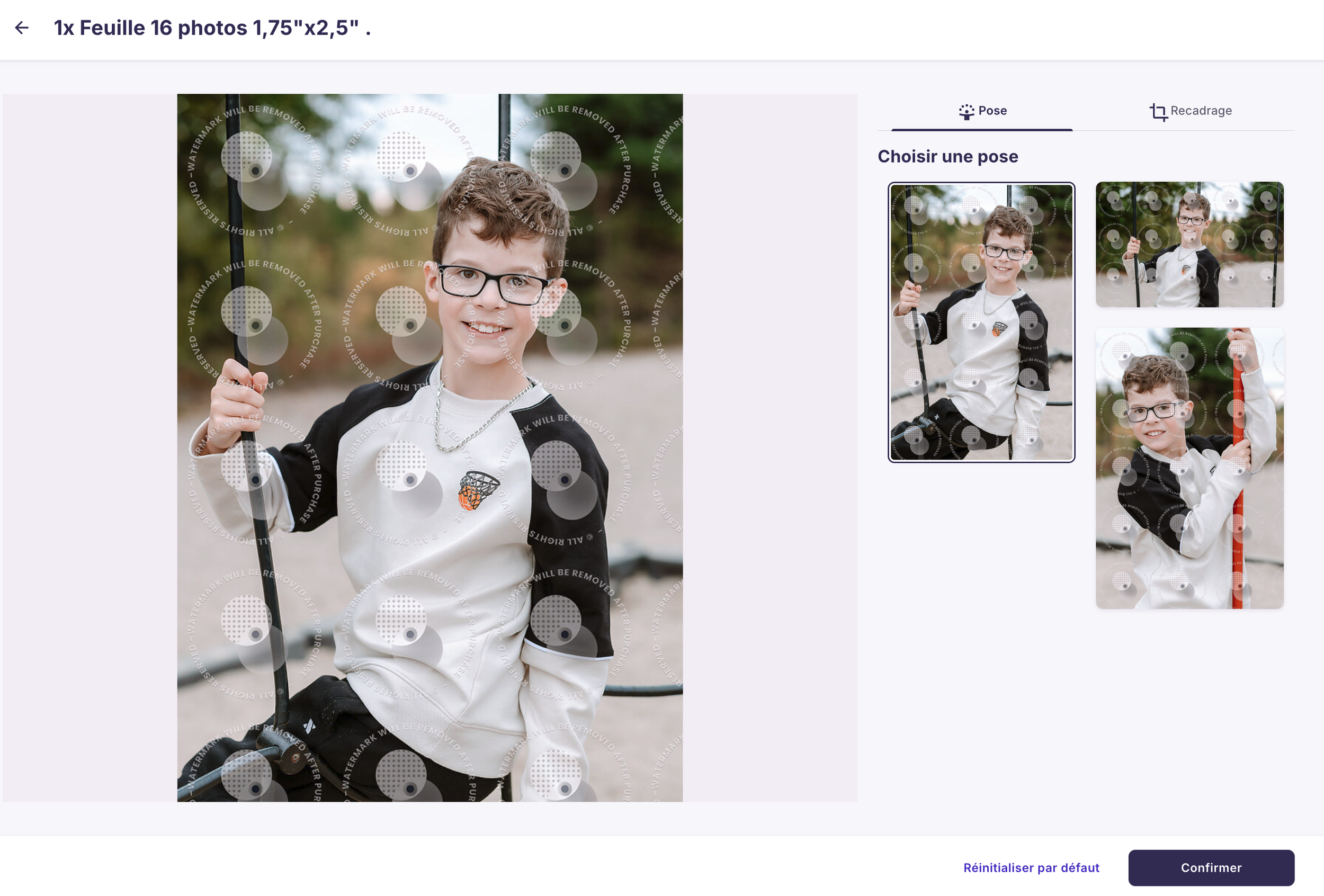 A) Cliquez sur le bouton “Personnaliser” sous chaque produit pour sélectionner la pose désirée pour cette impression photo.