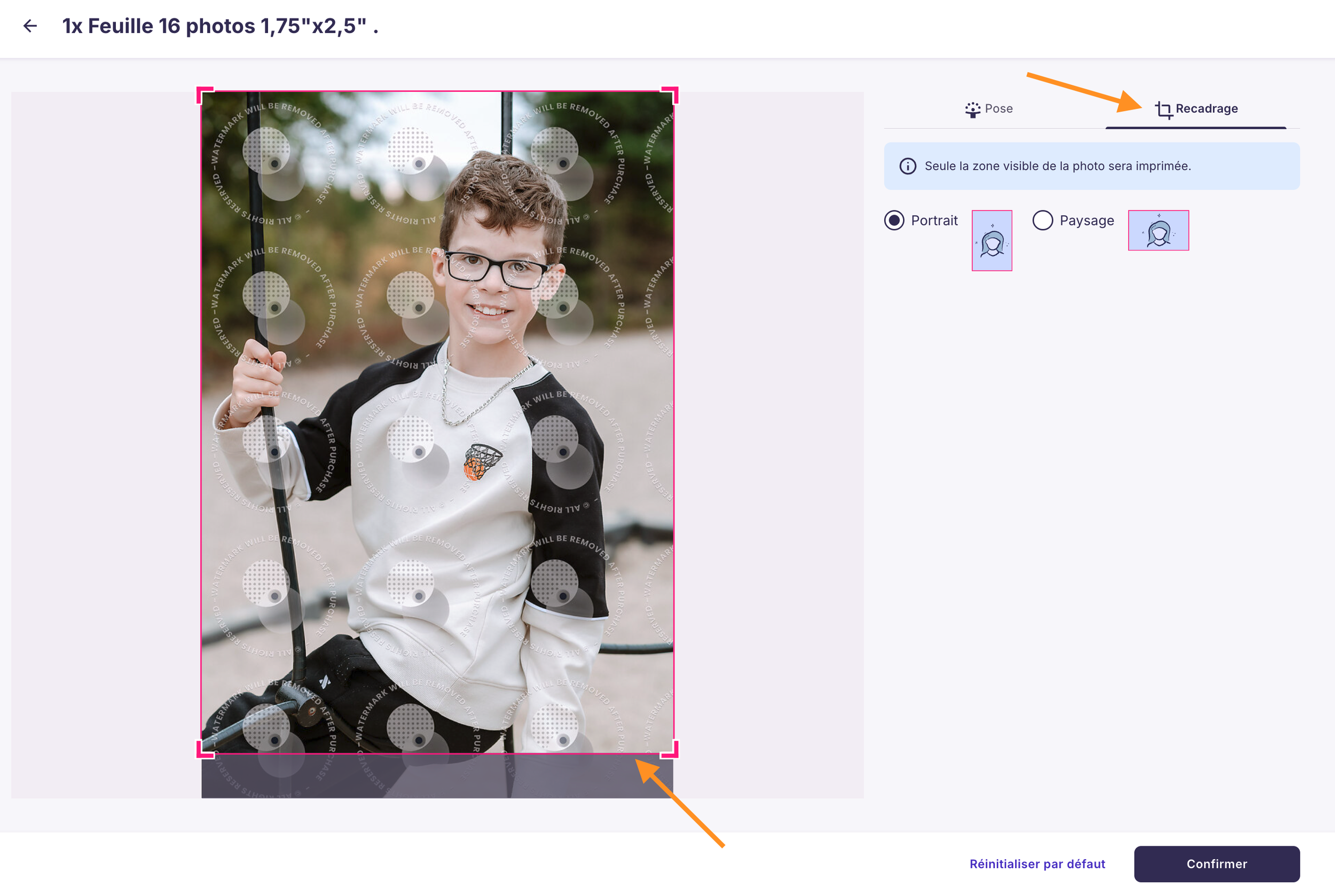 C) Cliquez sur l’onglet “Recadrage” pour ajuster le cadrage. L’encadré rouge représente la portion de l’image qui sera imprimée. Vous pouvez déplacer l’encadré rouge pour qu’il couvre la portion de l’image que vous souhaitez voir imprimer.